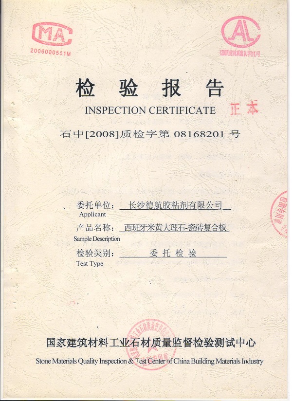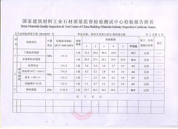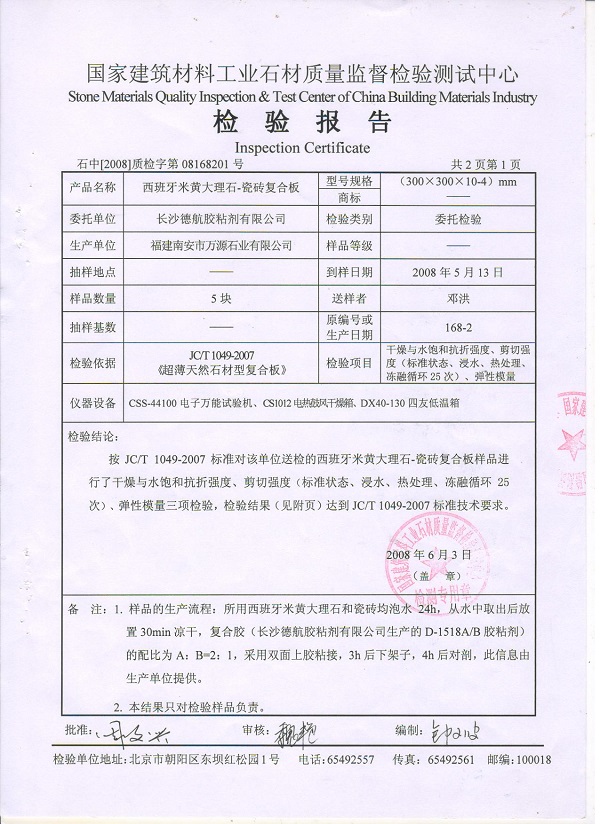 3、按照J(rèn)C/T1049-2007《超薄天然型石材復(fù)合板》標(biāo)準(zhǔn)進(jìn)行檢測。國家建筑材料石材質(zhì)量監(jiān)督檢驗(yàn)測試中心檢測結(jié)果于下: